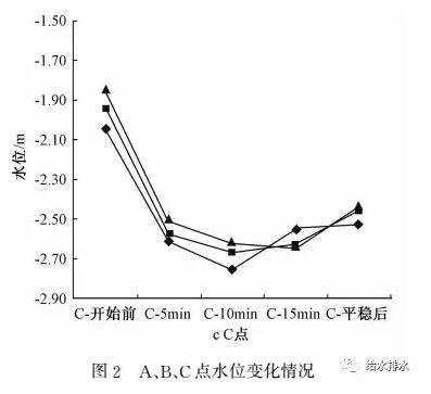 試驗發(fā)現(xiàn),A、B、C、D2、E1等5個點的水位,會隨F調(diào)蓄池進水至蓄滿而呈U型狀變化,以A、B、C為例(見圖2),基本都在10~15 min時水位變化最為明顯。但位于遠(yuǎn)端的D、E、D1等3個點幾乎未發(fā)生變化。由此可以初步判斷,F(xiàn)調(diào)蓄池對進水總管的拉動,至C點結(jié)束,總長約1 200 m;調(diào)蓄池的運行,僅對鄰近的管網(wǎng)起到了收水效果。