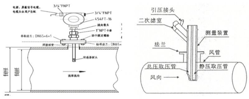 先期安裝流量測量設(shè)備為熱導(dǎo)式流速儀。測量元件為煙道插入式單點安裝,測量原理是流速儀探桿頭部有長短不一、前后布置的測溫探針兩支,通過煙氣流經(jīng)探針的先后溫差解算流速、流量。由于單點布置,只代表該點流速代表性低,與實際平均流速偏差較大,導(dǎo)致流量計算偏差。同時該流速儀結(jié)構(gòu)易產(chǎn)生探桿頭部煙溫探針積垢現(xiàn)象,一旦結(jié)垢將無法準確測出流速,需人工拆除進行清理,維護困難。