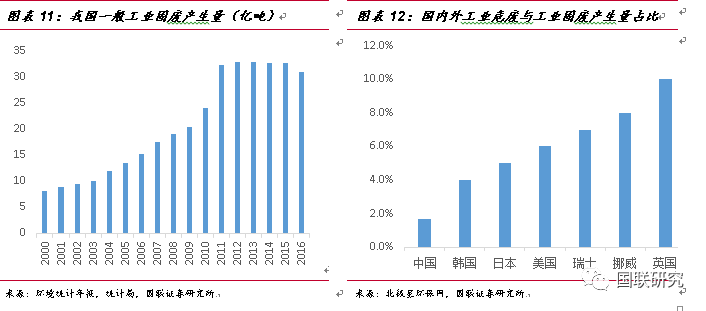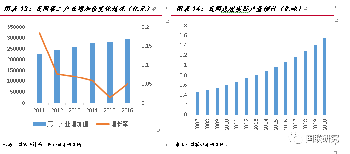 ②第二產(chǎn)業(yè)增加值測算法:由于危廢排放的企業(yè)多數(shù)來自于化工、有色等中游制造企業(yè),我們認(rèn)為危廢的實際產(chǎn)生量將與第二產(chǎn)業(yè)的景氣度是呈現(xiàn)正相關(guān)性。2007年至2016年,我國第二產(chǎn)業(yè)的增加值由11.58萬億元增長到29.65萬億元,復(fù)合增長率達(dá)9.91%,2007年污染源第一次普查時危廢實際產(chǎn)量為4573萬噸,在默認(rèn)普查數(shù)據(jù)為準(zhǔn)確數(shù)據(jù)的情況下,按照9.91%的危廢增長速率進(jìn)行測算,2016年我國危廢實際產(chǎn)生量將達(dá)到1.07億噸。