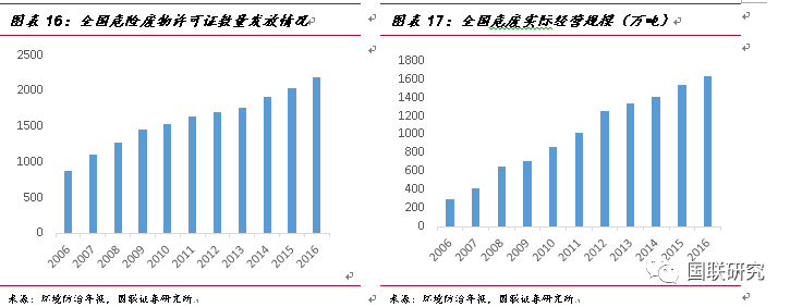 在一系列環(huán)保政策的刺激下,危廢處置行業(yè)需求將逐步迎來有效釋放。根據(jù)《2017年全國大、中城市固體廢物污染環(huán)境防治年報》統(tǒng)計數(shù)據(jù)顯示,截至2016年底,全國各省(區(qū)、市)頒發(fā)的危廢(包含醫(yī)療廢物)經(jīng)營許可證共計2195份,核準(zhǔn)經(jīng)營規(guī)模為6471萬噸/年(含收集經(jīng)營規(guī)模397萬噸/年)。而根據(jù)環(huán)境防治年報,2016年實際經(jīng)營規(guī)模為1629萬噸(含收集23萬噸),有效處理能力較低,大量的產(chǎn)能仍未完全釋放。