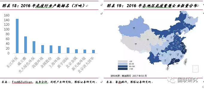 行業(yè)集中度低、規(guī)模小,公司處于絕對領(lǐng)先地位。我國的危廢行業(yè)的市場參與者眾多,但是具有規(guī)模效應(yīng)的企業(yè)很少,目前我國危廢行業(yè)呈現(xiàn)出的特征主要有以下幾點:①行業(yè)集中度低:根據(jù)Frost&Sullivan、遠(yuǎn)卓分析、前瞻產(chǎn)業(yè)研究院的統(tǒng)計數(shù)據(jù),截止 2016 年,行業(yè)內(nèi)排名前十大公司僅占總設(shè)計處置能力的6.8%,其中東江環(huán)保市占率為2.26%,處絕對領(lǐng)先地位;②危險廢物產(chǎn)生量與處理能力分布不匹配。2016年我國持危險廢棄物經(jīng)營許可證的企業(yè)數(shù)量為2149家,主要集中于長三角和珠三角區(qū)域,欠發(fā)達(dá)地區(qū)許可證數(shù)量少。其中江蘇、浙江和廣東三省資質(zhì)企業(yè)數(shù)量共計503家,占全國總數(shù)的30%以上。根據(jù)Frost&Sullivan的數(shù)據(jù),2015年危險廢物產(chǎn)生量主要集中在東部、西北部、中部,分別占總產(chǎn)生量的31%、24%,13%,可以看出華東地區(qū)及西北地區(qū)占危險廢物產(chǎn)生量的大部分。而經(jīng)濟(jì)發(fā)達(dá)地區(qū)如華東及華南占危險廢物處理能力的大部分。危廢處置行業(yè)中,東江環(huán)保、光大國際、威立雅中國、新宇國際等企業(yè)進(jìn)入行業(yè)較早,經(jīng)過多年的發(fā)展已經(jīng)具備規(guī)模和產(chǎn)能優(yōu)勢,而且位于危廢產(chǎn)生量較大的省份,有較強(qiáng)的客戶資源和競爭優(yōu)勢。③經(jīng)營企業(yè)規(guī)模小、處理能力弱。按照2016年核準(zhǔn)經(jīng)營規(guī)模和企業(yè)數(shù)量的數(shù)據(jù)測算,平均每家的核準(zhǔn)處理能力僅為3萬噸/年,并且大部分企業(yè)技術(shù)、資金等實力較弱,日均處理能力超過50噸的企業(yè)占比不到20%,達(dá)到1000噸的僅占0.3%,并且能夠處理25種以上危廢種類的企業(yè)僅為1%,絕大多數(shù)均小于10種。在2017年,東江環(huán)保已具備44類危險廢物經(jīng)營資質(zhì),在危廢行業(yè)中處于絕對領(lǐng)先地位。