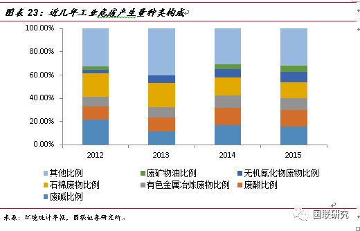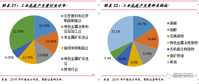 工業(yè)危廢的主要來源及種類構(gòu)成。鑒于對危險廢物的認(rèn)識不斷深入,在2016年6月21日,生態(tài)環(huán)境部重新修訂了《國家危險廢物名錄》,將危廢由49大類重新調(diào)整為46大類,新增117種類別,共計479種,而其中70%以上的危廢都來自于工業(yè)行業(yè)。據(jù)2015年環(huán)境統(tǒng)計年報數(shù)據(jù)統(tǒng)計,工業(yè)危廢中產(chǎn)量最大的行業(yè)分別為化學(xué)原料與化學(xué)制品制造業(yè)(占比19.2%)、有色金屬冶煉和壓延加工(占比15.6%)、非金屬礦采選業(yè)(占比13.8%)以及造紙和紙制品業(yè)(占比12.7%)。