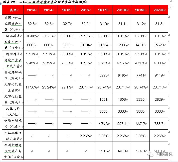 無害化處置市場潛力巨大,公司成長空間廣闊。我們預(yù)計在2018-2020年,全國危廢實際產(chǎn)量將會持續(xù)增長,約為1.3-1.56億噸,截至2016年底,全國各省(區(qū)、市)頒發(fā)的危廢(包含醫(yī)療廢物)經(jīng)營許可證共計2195份,核準(zhǔn)經(jīng)營規(guī)模為6471萬噸/年(含收集經(jīng)營規(guī)模397萬噸/年)。我們通過測算未來危廢實際產(chǎn)量與現(xiàn)有核準(zhǔn)規(guī)模的缺口,按無害化處置比例28.74%,3000元/噸的平均處置價格進(jìn)行測算,則預(yù)計到2020年,危廢無害化處置行業(yè)缺口將有望達(dá)到788.7億元。對于東江環(huán)保,2016、2017年危廢處置總產(chǎn)能分別為146萬噸、160萬噸,按照16年核準(zhǔn)經(jīng)營規(guī)模6471萬噸/年進(jìn)行計算,市場占有率在2.26%,假設(shè)市占率保持不變,對應(yīng)的公司2020年新增危廢處置總產(chǎn)能的空間(包含資源化、無害化)大約是206.8萬噸,合計總產(chǎn)能規(guī)模達(dá)到352.8萬噸,較目前公司的產(chǎn)能規(guī)模160萬噸仍有較大的增長空間。