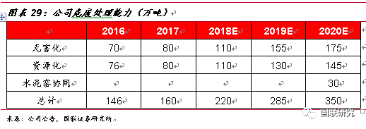 公司始終專注于危險廢物的無害化處理及資源化利用,憑借自身突出的技術(shù)優(yōu)勢、資深的管理經(jīng)驗以及資本優(yōu)勢等,公司在危廢處理行業(yè)持續(xù)鞏固龍頭運營商的地位。截至2017年,公司擁有工業(yè)危險廢物處理資質(zhì)達(dá)160萬噸/年,在行業(yè)內(nèi)遙遙領(lǐng)先。按照公司未來幾年規(guī)劃產(chǎn)能,2020年預(yù)計公司將擁有350萬噸/年的綜合治理產(chǎn)能,包括水泥窯協(xié)同處置產(chǎn)能,CAGR達(dá)29.81%。對比我們上文對公司未來產(chǎn)能空間的測算,假設(shè)市占率2.26%保持不變,公司預(yù)期產(chǎn)能352.8萬噸,所以我們判斷公司規(guī)劃的產(chǎn)能實現(xiàn)概率很高。