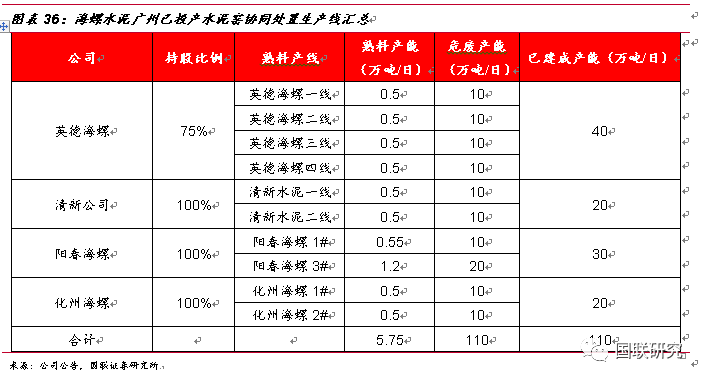 以廣東省為試點,公司攜手海螺創(chuàng)業(yè)深耕危廢領(lǐng)域。公司與海螺創(chuàng)業(yè)將以包括但不限于股權(quán)合作的方式進(jìn)行廣東省水泥窯協(xié)同處置固廢布點,包括但不限于以《廣東省環(huán)境保護(hù)“十三五”規(guī)劃》和《廣東省水泥行業(yè)轉(zhuǎn)型升級技術(shù)路線和行動計劃(2016-2018年)》為指導(dǎo)。根據(jù)“十三五”期間規(guī)劃要求,廣東省水泥窯協(xié)同處置危廢產(chǎn)能為500萬噸/年,據(jù)海螺水泥公司公告統(tǒng)計,其在廣東省內(nèi)共計有4家子公司,分別為英德海螺、清新水泥、化州海螺以及陽春海螺,共計10條投產(chǎn)線,已建成熟料產(chǎn)能分別為2萬噸/日、1萬噸/日、1萬噸/日以及1.75萬噸/日,若全部完成協(xié)同改造,危廢產(chǎn)能總計將達(dá)110萬噸/年。