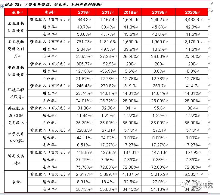 1.河北衡水睿韜項目(無害化)、江西固廢二期(資源化)、福建南平(無害化)、山東濰坊東江(無害化+資源化)、湖北仙桃綠怡(資源化)、江蘇南通(無害化)、泉州PPP項目(無害化+資源化)項目于2018年建成并投產(chǎn)使用。2018-2020年無害化產(chǎn)能分別為110萬噸、155萬噸、205萬噸。2.考慮到后期有部分項目進(jìn)行技術(shù)升級改造,以及公司正在加大物化業(yè)務(wù)市場拓展和資質(zhì)匹配,2018-2020年產(chǎn)能利用率按照60%、62%、65%進(jìn)行測算。3.由于目前危廢處置仍然存在較大的供需缺口,暫不考慮價格因素對公司收入的影響,無害化處置價格2018-2020年全部按照2500元/噸進(jìn)行預(yù)測。4.由于自2016年10月開始大宗商品價格有所回暖,近期趨于穩(wěn)定,根據(jù)上海金屬網(wǎng)價格顯示,金屬銅2016-2017年均價上漲28%,預(yù)計2017-2020年資源化產(chǎn)品價格增幅分別為14%、0%、0%、0%,均價全部按照1500元/噸進(jìn)行計算,2018-2020年資源化產(chǎn)能按照110萬噸、130萬噸、145萬噸計算。5.保守起見,暫不考慮參股海螺創(chuàng)業(yè)帶來的收入影響。