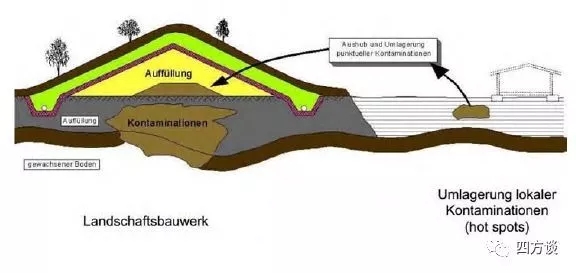 (2)隔離封閉,把污染物集中并用隔離膜封閉(Sicherungsmassnahmen)。當(dāng)污染物污染比較嚴(yán)重,分布范圍大、深,且對地下水也已經(jīng)造成污染,這種情況下,對污染源進(jìn)行清挖、換土費用太高,一般選擇就地隔離封閉處理,阻止污染物進(jìn)一步向外擴(kuò)散。具體做法是:把場地的污染土壤集中在一起,堆成山丘,鋪上隔離層(一種很厚的塑料膜,使用壽命100余年),以免繼續(xù)污染地下水或者空氣。在隔離層之上鋪大約2米厚的可供植物生長的新土層,進(jìn)行景觀再造,改造成為休閑場所,如圖2所示。