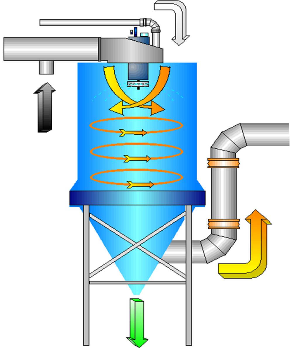 鍋爐出口溫度為210℃的煙氣自頂部導入噴霧塔,噴霧塔頂部導流片使煙氣進入噴霧塔后形成旋轉(zhuǎn)紊流流動,噴霧塔的頂部布置石灰漿液噴霧機,將石灰漿液粉碎成直徑為50微米以下的霧滴,以大大提高石灰漿液的比表面積和增加煙氣中酸性氣體分子與石灰漿液中氫氧化鈣分子接觸的面積和接觸的時間,以確保較高的反應(yīng)效率,酸性氣體與石灰漿液的反應(yīng)后生成粉塵顆粒,當煙氣從噴霧塔導出時隨著流向的改變,在離心力的作用下,有較多的粉塵脫離煙氣掉入灰斗。