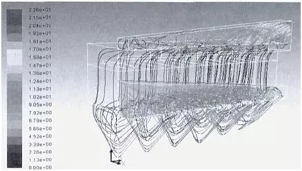利用CAE技術(shù)對(duì)設(shè)備內(nèi)部進(jìn)行CFD流場(chǎng)模擬分析(見(jiàn)圖5),以此結(jié)合新型均風(fēng)結(jié)構(gòu)(已獲國(guó)家實(shí)用新型專(zhuān)利)來(lái)改善內(nèi)部氣流分布,進(jìn)一步降低設(shè)備結(jié)構(gòu)阻力。
