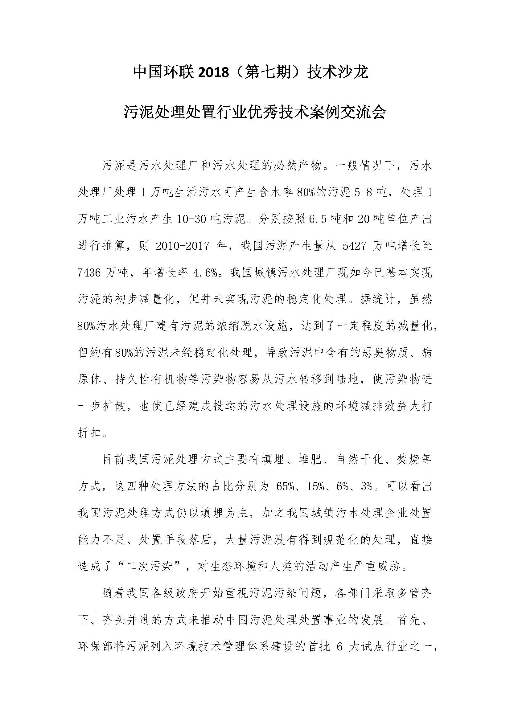 中國(guó)環(huán)聯(lián)2018(第七期)技術(shù)沙龍 污泥處理處置行業(yè)優(yōu)秀技術(shù)案例交流會(huì)