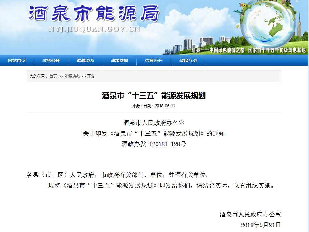 酒泉市能源局日前印發(fā)《酒泉市“十三五”能源發(fā)展規(guī)劃》,《規(guī)劃》包括近零碳排放區(qū)建設(shè)等內(nèi)容,包含一個垃圾發(fā)電項目和三個生物質(zhì)發(fā)電項目。