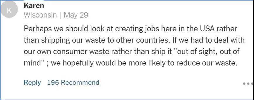 “我們應該致力于在美國國內(nèi)創(chuàng)造更多的垃圾處理相關的就業(yè)崗位,而不是把垃圾轉(zhuǎn)運到其他國家。如果我們能意識到自行處理垃圾是件多么困難的事情的話,我們的浪費也就自然而然減少了?!?/p>