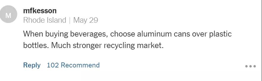 “當我們買飲料時,應該盡量買那些鋁制罐裝的而不是塑料的。鋁材質(zhì)有著更強大的回收市場?!?/p>