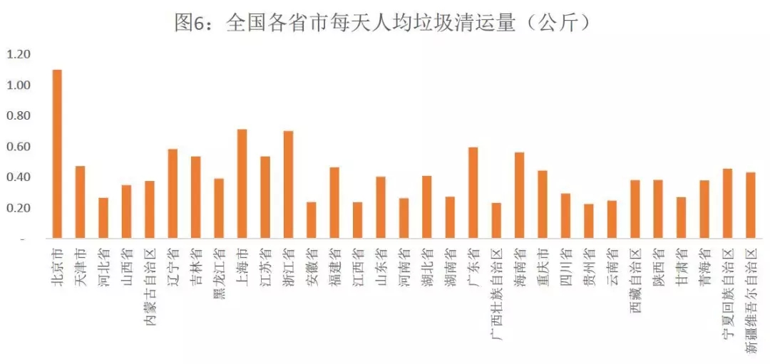 下圖為2016年全國各大省市垃圾清運量的數(shù)據(jù),可以看出北京市以每日人均清運1.1公斤垃圾領(lǐng)銜全國首位。該數(shù)據(jù)并不代表北京市居民一定是產(chǎn)生垃圾最多的,因為垃圾清運量與垃圾產(chǎn)生量中間有一定差異,且北京的垃圾清運率在全國應該是比較充分的。