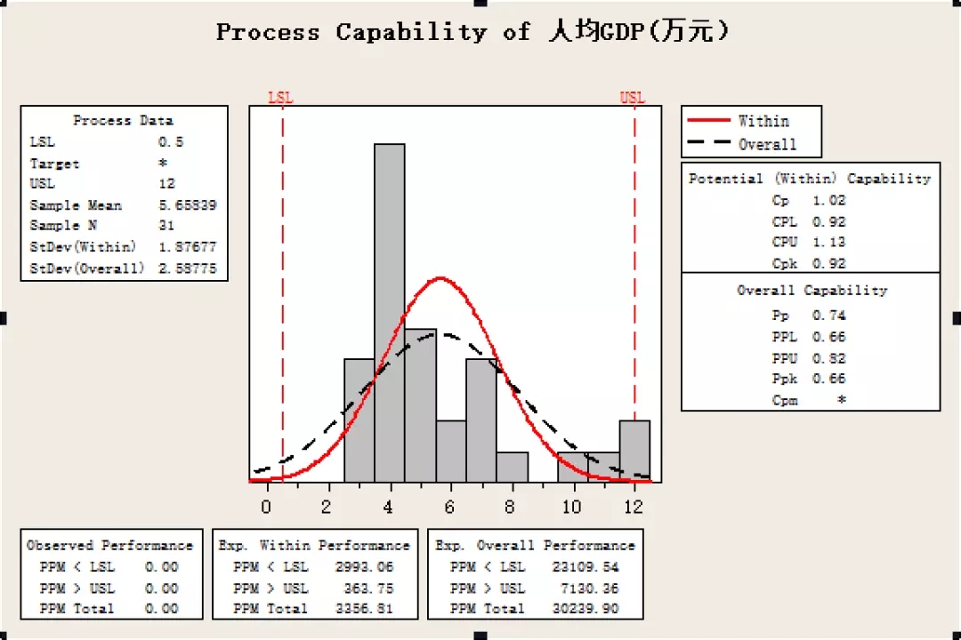 通過對全國各大省市人均GDP直方圖及正態(tài)分布圖進行分析,人均GDP的分布也服從正態(tài)分布,大部分省市的年人均GDP位于4-7萬元區(qū)間,全國省市人均GDP均值為5.66萬元。