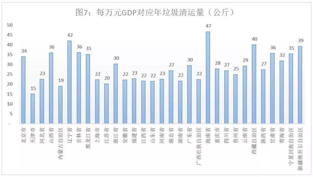 從這個角度將,海南、遼寧省每萬元GDP對應的年垃圾清運量分別是47、42公斤,居全國前列。天津市每萬元GDP對應年垃圾清運量15公斤,不考慮其他因素,單從該數(shù)據(jù)上看,天津的GDP是最“衛(wèi)生”的GDP。