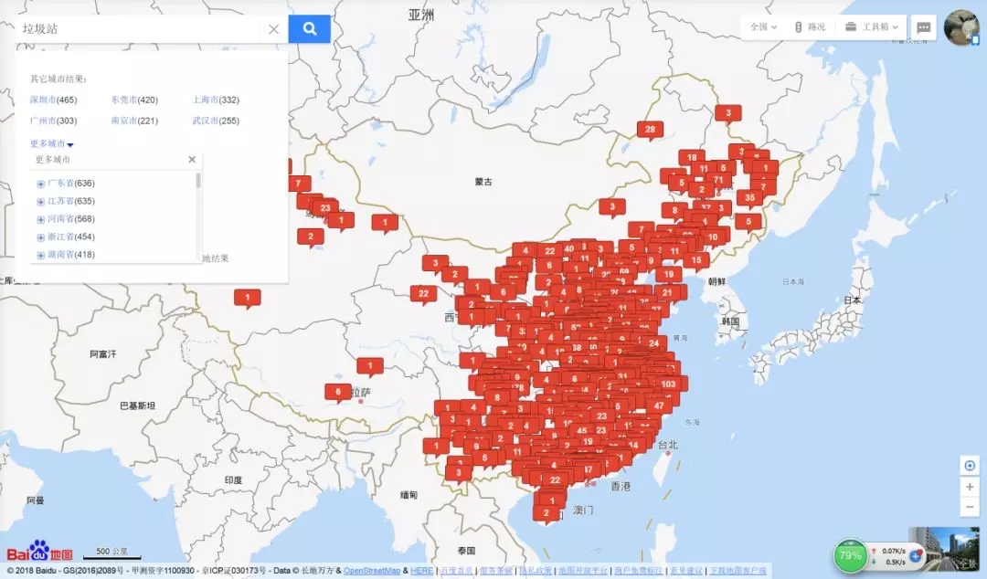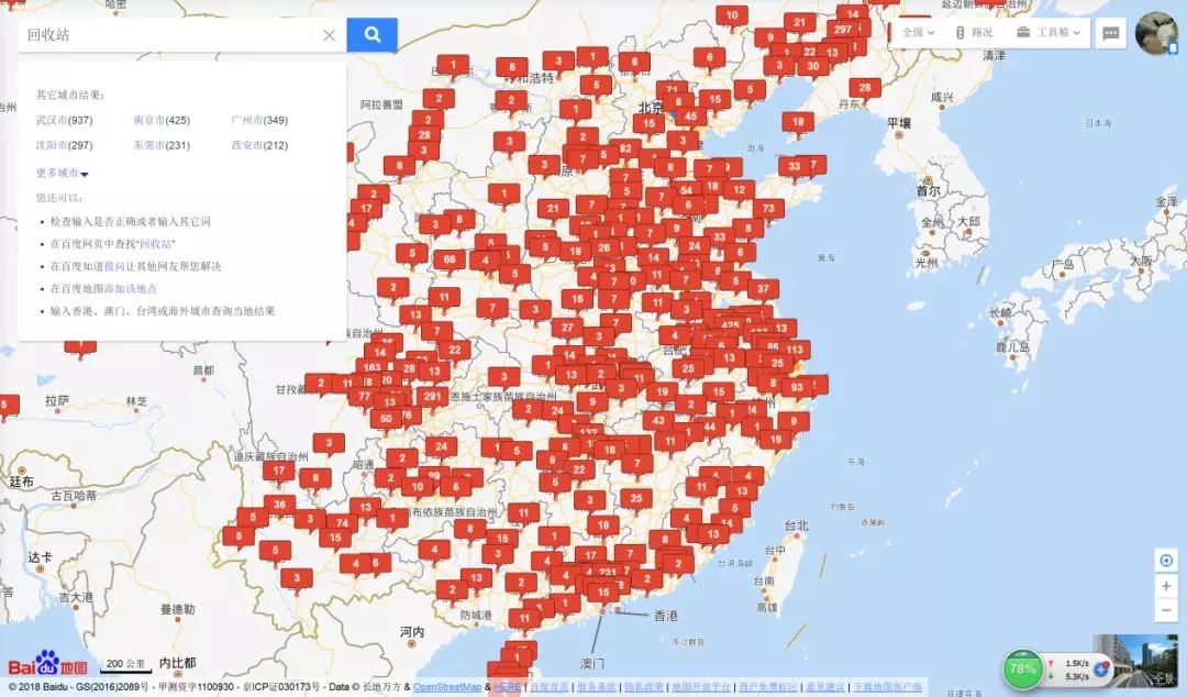 通過百度地圖對回收站及垃圾站兩個關(guān)鍵詞進行搜索,出現(xiàn)如下兩張圖注1,垃圾站與回收站恐怕是普通居民最不愿意接觸的地方之一,但是通過百度地圖搜索,作者發(fā)現(xiàn),垃圾站和回收站幾乎是人口和經(jīng)濟的標志之一,哪里人口密集和經(jīng)濟發(fā)達,哪里的垃圾站和回收站就密集,根據(jù)對百度地圖數(shù)據(jù)統(tǒng)計,全國垃圾站數(shù)量、回收站數(shù)量分別為8197個、7733個,其中北京市垃圾站、回收站數(shù)量分別為130個、71個。