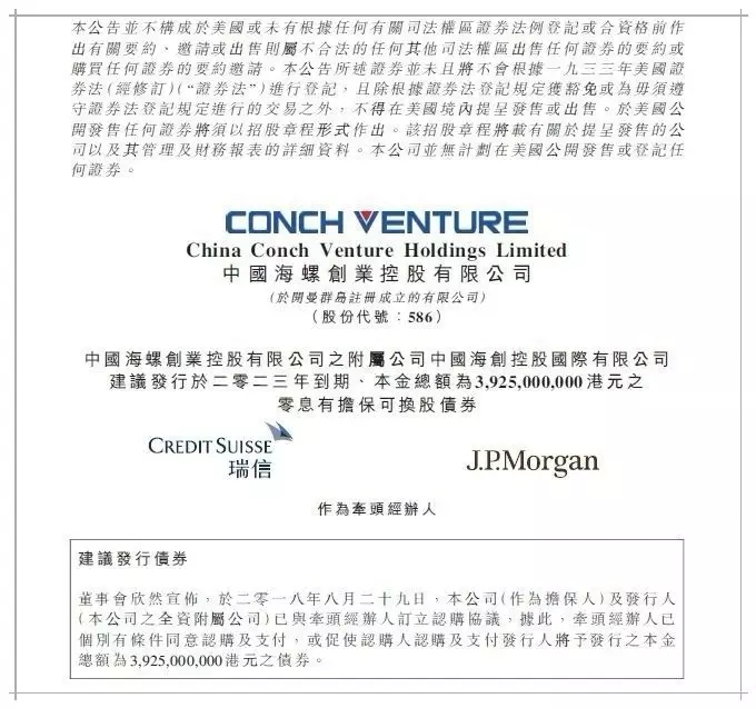 2018年8月30日凌晨,海螺創(chuàng)業(yè)抓住有利的市場機遇,選擇合適的發(fā)行窗口,成功發(fā)行了5年期39.25億港元零票息可轉(zhuǎn)換債券。