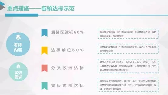 根據《上海市生活垃圾分類達標、示范街道(鎮(zhèn)、鄉(xiāng))考評辦法(試行)》,要成為生活垃圾分類達標街鎮(zhèn),其轄區(qū)內60%的居住區(qū)和單位先要達標,轄區(qū)內各類垃圾的分類投放、收集(分揀、暫存)、運輸物流體系明確,還要建立垃圾分類領導和協(xié)調機制,落實居住區(qū)垃圾分類居委、物業(yè)、業(yè)主、第三方的責任人和所負責任。成為生活垃圾分類示范街鎮(zhèn)的門檻更高,轄區(qū)內80%的居住區(qū)和單位生活垃圾分類實效要達標。