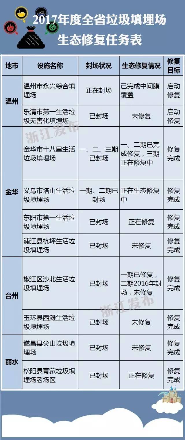 2017年全省計(jì)劃開(kāi)展10個(gè)垃圾填埋場(chǎng)生態(tài)修復(fù)工程,浙江要通過(guò)這些垃圾填埋場(chǎng)的生態(tài)化改造,拆除環(huán)?!岸〞r(shí)炸彈”。具體名單↓