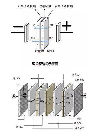 雙極膜亦稱雙極性膜,是特種離子交換膜,它是由一張陽膜和一張陰膜復(fù)合制成的陰、陽復(fù)合膜。該膜的特點(diǎn)是在直流電場(chǎng)的作用下,陰、陽膜復(fù)合層間的H2O解離成H+和OH-并分別通過陰膜和陽膜,作為H+和OH-離子源。在水處理中主要通過離子交換達(dá)到凈化水資源的目的。