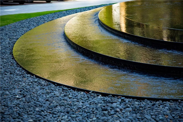 以中心橢圓形鏡面水景為中心,黑色鏡面石材、爐渣、礫石、草帶等材質(zhì)層層錯(cuò)位環(huán)繞,形成寬窄變化有致、富有動(dòng)感的弧形帶狀空間,用不銹鋼條做收邊分割,線條流暢優(yōu)美。