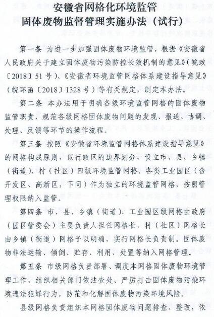 日前,安徽環(huán)保廳公布《安徽省網(wǎng)格化環(huán)境監(jiān)管固體廢物監(jiān)督管理實(shí)施辦法》,詳情如下:
