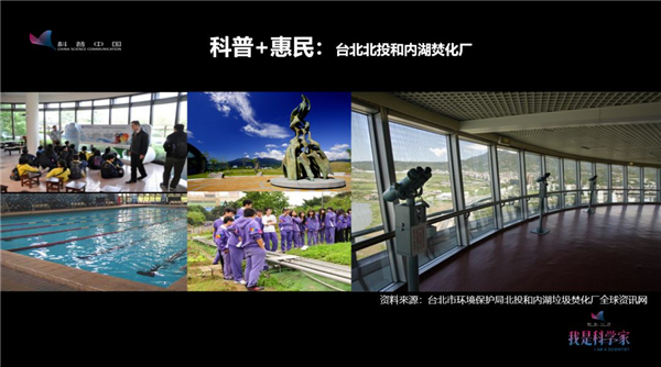 這是在臺(tái)北建設(shè)的北投和內(nèi)湖垃圾焚燒廠,這里有環(huán)境教育教室,有游泳池為周邊的居民和周邊的中小學(xué)提供免費(fèi)的游泳服務(wù),有建立在煙囪頂部的旋轉(zhuǎn)餐廳。如果垃圾焚燒廠煙囪里面有污染物質(zhì)超標(biāo)排放,那么餐廳這個(gè)位置應(yīng)該是最容易受到污染的,而事實(shí)上排放是達(dá)標(biāo)的。大家可以在這里用餐、休息、觀景,沒有安全的隱患。