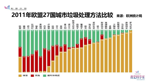 通常來說垃圾有三種處理方式:資源的循環(huán)再利用,垃圾的衛(wèi)生填埋和垃圾的焚燒發(fā)電。通過這張圖,我們可以分析得出一個(gè)結(jié)論:歐盟國家中經(jīng)濟(jì)生活水平比較低的國家,最主要的處理方式是填埋。