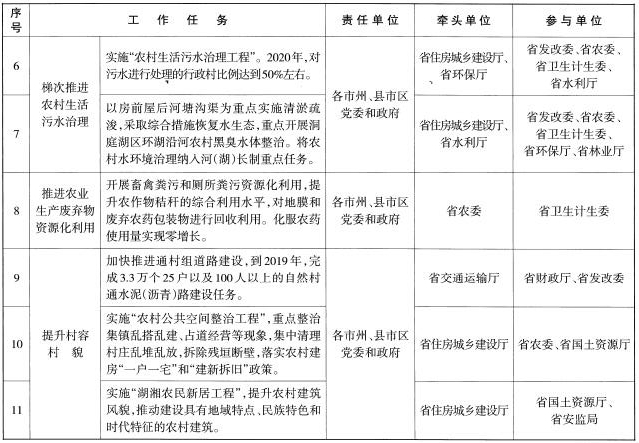 (一)加強(qiáng)組織領(lǐng)導(dǎo)。各級(jí)黨委和政府要把農(nóng)村人居環(huán)境整治作為實(shí)施鄉(xiāng)村振興戰(zhàn)略的重要任務(wù)。省農(nóng)委具體負(fù)責(zé)工作協(xié)調(diào)、組織推動(dòng)和督導(dǎo)考核,負(fù)責(zé)農(nóng)業(yè)生產(chǎn)廢棄物污染治理和村容村貌提升等工作。省財(cái)政廳要根據(jù)農(nóng)村人居環(huán)境整治任務(wù)的資金需求,做好資金籌措工作。省發(fā)改委要做好項(xiàng)目統(tǒng)籌,爭(zhēng)取中央預(yù)算內(nèi)資金支持。省住房城鄉(xiāng)建設(shè)廳負(fù)責(zé)農(nóng)村生活垃圾污水治理、農(nóng)村廁所革命、農(nóng)村黑臭水體整治和農(nóng)房建設(shè)管理等工作。省水利廳負(fù)責(zé)清淤疏浚等工作。省環(huán)保廳負(fù)責(zé)農(nóng)村環(huán)境綜合整治全省域覆蓋工作。省交通運(yùn)輸廳負(fù)責(zé)農(nóng)村道路建設(shè)工作。其他相關(guān)部門參照國(guó)家部委有關(guān)工作職責(zé)分工,做好全省農(nóng)村人居環(huán)境整治相關(guān)工作的落實(shí)推進(jìn)。市州黨委和政府做好上下銜接、域內(nèi)協(xié)調(diào)和督促檢查工作??h級(jí)黨委和政府是農(nóng)村人居環(huán)境整治的責(zé)任主體,黨政主要負(fù)責(zé)同志負(fù)主體責(zé)任,要做好項(xiàng)目落地、資金使用、推進(jìn)實(shí)施等工作,對(duì)實(shí)施效果負(fù)責(zé)。鄉(xiāng)鎮(zhèn)黨委和政府要做好具體組織實(shí)施工作。村委會(huì)、作業(yè)區(qū)(生產(chǎn)隊(duì))負(fù)責(zé)動(dòng)員黨員干部和村民完善村規(guī)民約,發(fā)動(dòng)群眾投工投勞開(kāi)展農(nóng)村人居環(huán)境整治。