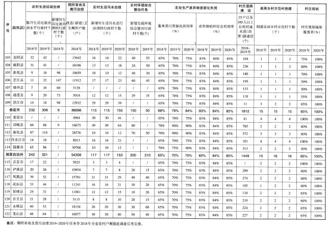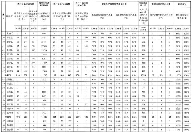 (五)著力提升村容村貌。實(shí)施“農(nóng)村公共空間整治工程”,整治集鎮(zhèn)亂搭亂建、占道經(jīng)營(yíng)等現(xiàn)象,整治村莊公共空間和庭院環(huán)境,及時(shí)清理私搭亂建、亂堆亂放,開(kāi)展“空心房”整治,拆除殘?jiān)珨啾?,?fù)耕復(fù)綠,堅(jiān)持“一戶一宅”“建新拆舊”。鼓勵(lì)創(chuàng)新,依托互聯(lián)網(wǎng)和專業(yè)化公司,探索農(nóng)戶閑置房屋多元化利用。加快推進(jìn)通村組道路建設(shè),完成3.3萬(wàn)個(gè)25戶以及100人以上的自然村通水泥(瀝青)路建設(shè)任務(wù)。充分利用本地資源,因地制宜選擇路面材料,加快推進(jìn)入戶道路建設(shè)。實(shí)施“湖湘農(nóng)民新居工程”,提升農(nóng)村建筑風(fēng)貌,推動(dòng)建設(shè)具有地域特點(diǎn)、民族特色和時(shí)代特征的農(nóng)村建筑。實(shí)施“傳統(tǒng)村落保護(hù)工程”,傳統(tǒng)村落、民居保護(hù)機(jī)制全面形成,歷史文化名鎮(zhèn)名村得到有效保護(hù)。實(shí)施“農(nóng)村美化綠化氣化工程”,引導(dǎo)各地選用本地鄉(xiāng)土樹(shù)種,在村莊周邊、庭院宅旁、村內(nèi)道路河渠兩側(cè)栽植樹(shù)木,村莊綠化覆蓋率達(dá)到30%以上,70%以上村莊達(dá)到綠色村莊標(biāo)準(zhǔn)。對(duì)村莊古樹(shù)名木掛牌建檔,挖掘和發(fā)揮古樹(shù)名木的歷史文化和景觀價(jià)值。積極引導(dǎo)和推動(dòng)在村莊主要出入口、主干道和公共活動(dòng)空間合理設(shè)置路燈。開(kāi)展城鄉(xiāng)環(huán)境衛(wèi)生整潔行動(dòng),推進(jìn)衛(wèi)生縣城、衛(wèi)生鄉(xiāng)鎮(zhèn)等衛(wèi)生創(chuàng)建活動(dòng)。深入推進(jìn)“百城千鎮(zhèn)萬(wàn)村”新農(nóng)村建設(shè)工程,重點(diǎn)開(kāi)展美麗鄉(xiāng)村示范村創(chuàng)建和縣鄉(xiāng)全域推進(jìn)試點(diǎn)工作。持續(xù)推進(jìn)農(nóng)村環(huán)境綜合整治全省域覆蓋工作。2018年,完成1.8萬(wàn)個(gè)自然村道路建設(shè),完成3000個(gè)村的農(nóng)村環(huán)境綜合整治任務(wù)。2019年,完成1.5萬(wàn)個(gè)自然村道路建設(shè),完成2000個(gè)村的農(nóng)村環(huán)境綜合整治任務(wù)。2020年,全面完成農(nóng)村環(huán)境綜合整治全省域覆蓋工作任務(wù)。