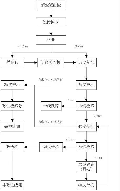 鋼渣的破碎、磁選篩分工藝流程是回收渣鋼的最基本流程,所用的破碎機(jī)包括顎式破碎機(jī)、圓錐破碎機(jī)、反擊式破碎機(jī)和雙輥破碎機(jī)等,磁選機(jī)包括跨帶式磁選機(jī)和電磁鐵式磁選機(jī),篩分設(shè)備包括格柵、單層及雙層振動(dòng)篩等。