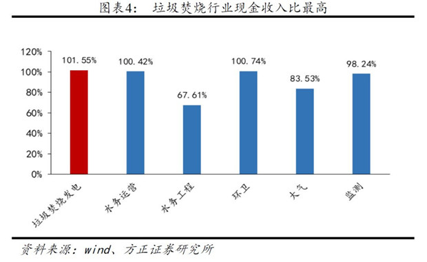 從現(xiàn)金收入比來看,2017年垃圾焚燒發(fā)電現(xiàn)金收入比101.55%,高于其他細(xì)分行業(yè),表現(xiàn)出運(yùn)營類業(yè)務(wù)良好的現(xiàn)金流情況。