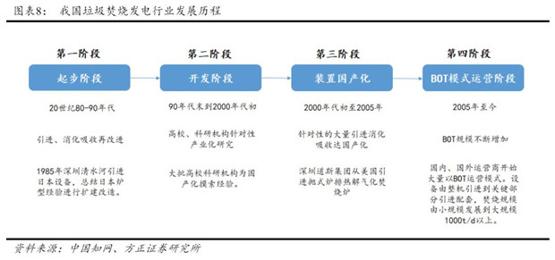 我國垃圾焚燒發(fā)電行業(yè)起步于20世80年代末,通過引進(jìn)國外先進(jìn)的焚燒設(shè)備和技術(shù),消化吸收優(yōu)化,先后經(jīng)歷了產(chǎn)業(yè)化研發(fā)、裝置國產(chǎn)化等階段。