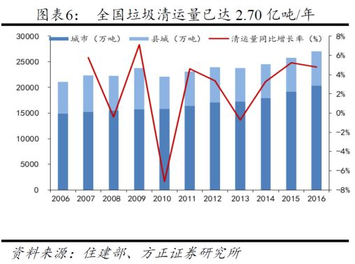 從生活垃圾產(chǎn)量角度,隨著我國城鎮(zhèn)化進(jìn)程的推進(jìn),城市生活垃圾清運(yùn)量逐年增長,2016年生活垃圾清運(yùn)量已經(jīng)達(dá)到2.70億噸,其中城市生活垃圾清運(yùn)量2.03億噸,縣城生活垃圾清運(yùn)量0.67億噸,并在以每年4%-5%的增速逐年攀升。