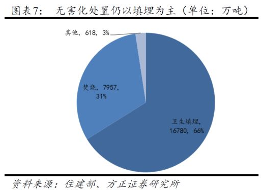 細(xì)分來看,無害化處置中填埋、焚燒、其他方式年處置量分別為1.68億噸、0.80億噸、0.06億噸,占比分別為66%、31%和2%,衛(wèi)生填埋仍然是無害化處置的主流方式。