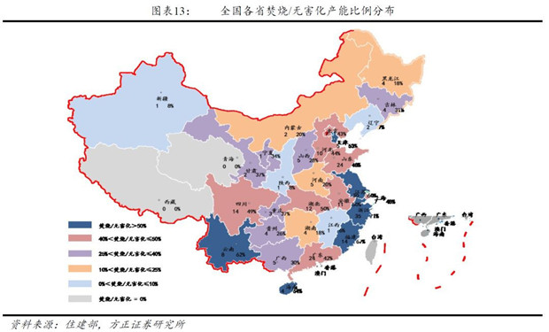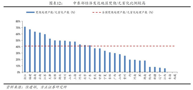 從焚燒處理占無害化產(chǎn)能比例來看,2016年全國焚燒處理占無害化處理比例為41%,全國有14個(gè)省焚燒處理占無害化處理比例超過該比例,且大多分布在中東部經(jīng)濟(jì)發(fā)展程度較高的地區(qū),其中浙江省焚燒處理占無害化處理比例最高,達(dá)到了71%。