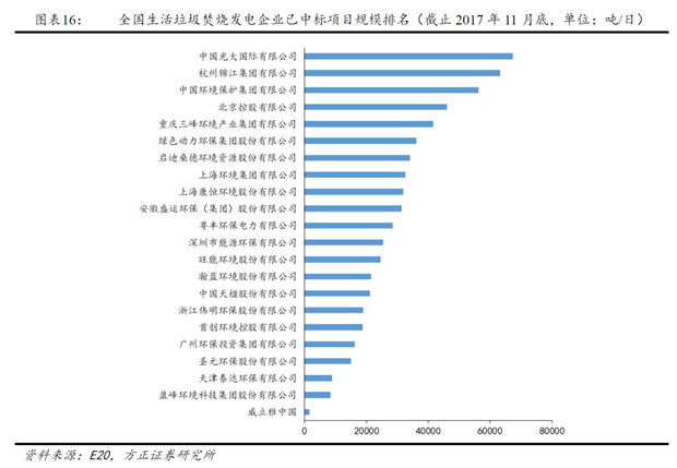 根據(jù)E20研究院統(tǒng)計(jì)排名,截止2017年11月底,已中標(biāo)的垃圾焚燒發(fā)電項(xiàng)目規(guī)模前五企業(yè)項(xiàng)目規(guī)模占比達(dá)到 42.26%,規(guī)模前十企業(yè)項(xiàng)目規(guī)模占比達(dá)到67.86%,行業(yè)市場集中度較高。