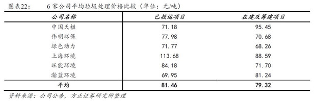 我們根據(jù)上市公司公開披露的項(xiàng)目信息統(tǒng)計(jì),取各個(gè)項(xiàng)目垃圾處置價(jià)格的平均值,對6家A股上市公司進(jìn)行比較。已投運(yùn)項(xiàng)目平均處置價(jià)格81元/噸,在建及籌建項(xiàng)目平均處置價(jià)格79元/噸,行業(yè)競爭激烈導(dǎo)致行業(yè)整體垃圾處置價(jià)格有所下降。