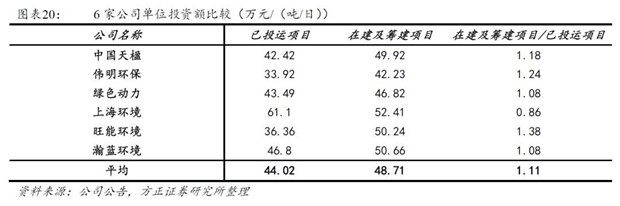 項(xiàng)目投資建設(shè)決定了在建工程轉(zhuǎn)無形資產(chǎn)的賬面價(jià)值,通過折舊攤銷間接影響運(yùn)營期盈利能力,而建設(shè)總投資中設(shè)備購置占比約50%。比較6家公司單位垃圾處置投資額,偉明環(huán)保最低,上海環(huán)境最高,與設(shè)備是否自產(chǎn)和成本管控有關(guān)。