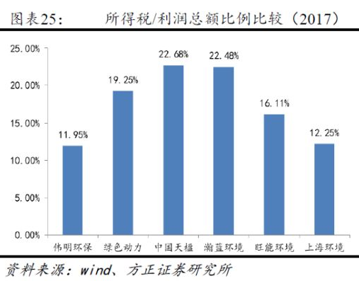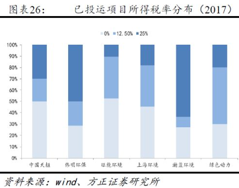 因此,根據(jù)項(xiàng)目投運(yùn)時(shí)間不同,各公司的所得稅率存在一定差異。我們比較了6家上市公司合并報(bào)表層面的所得稅/利潤總額比例,其中偉明環(huán)保最低,為11.95%,主要是由于新投運(yùn)的永強(qiáng)二期項(xiàng)目貢獻(xiàn)凈利潤較多;中國天楹最高,為22.68%,公司海外子公司的所得稅率較高所致。