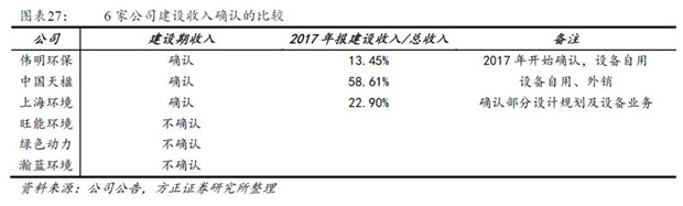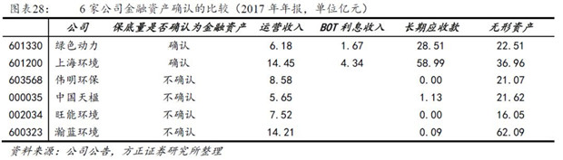 6家上市公司中,綠色動力、上海環(huán)境將保底垃圾處置費(fèi)確認(rèn)為金融資產(chǎn)-長期應(yīng)收款,建設(shè)投資剩余部分確認(rèn)為無形資產(chǎn)-特許經(jīng)營權(quán);而偉明環(huán)保、中國天楹、旺能環(huán)境、瀚藍(lán)環(huán)境將全部建設(shè)投資轉(zhuǎn)入無形資產(chǎn)。