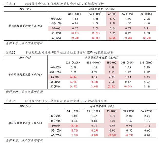 通過敏感性測試,項(xiàng)目NPV影響因素由大到小依次為:單位投資額>單位垃圾上網(wǎng)電量>特許經(jīng)營期限>垃圾處置費(fèi)。單位投資額對于項(xiàng)目NPV影響最大,建設(shè)期成本管控對于項(xiàng)目整體估值影響最大;其次為單位垃圾上網(wǎng)電量,受到垃圾熱值、焚燒設(shè)備效率、自用電比例等因素影響;其次為特許經(jīng)營年限;最后為垃圾處置費(fèi)。
