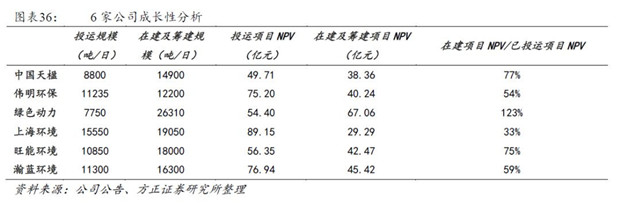通過在建及籌建項(xiàng)目NPV/已投運(yùn)項(xiàng)目NPV的指標(biāo)來表現(xiàn)公司成長性,成長性由高到低依次為:綠色動力、中國天楹、旺能環(huán)境、偉明環(huán)保、瀚藍(lán)環(huán)境、上海環(huán)境。