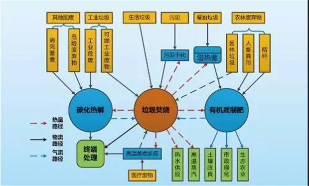 圍繞城市固廢的協(xié)同處置,徐工推出了“以廢治廢”的工藝處理方案,建設(shè)綜合循環(huán)產(chǎn)業(yè)園。以城市垃圾清潔焚燒為基礎(chǔ),利用產(chǎn)生的熱能用于有機(jī)廢物的資源化利用、危險(xiǎn)廢物的無氧碳化處理,并將處理過程中產(chǎn)生的臭氣、污水等物質(zhì)引入到焚燒系統(tǒng),實(shí)現(xiàn)了能量的階梯利用和固體廢物的循環(huán)處理。