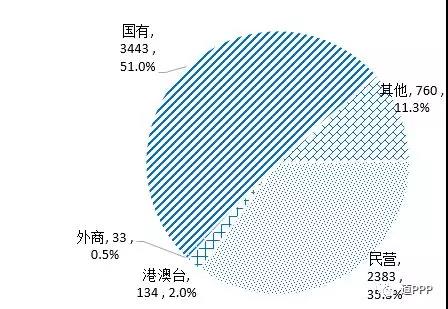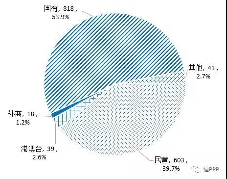 社會(huì)資本合作方類型。865個(gè)落地示范項(xiàng)目中包括446個(gè)獨(dú)家社會(huì)資本項(xiàng)目和419個(gè)聯(lián)合體項(xiàng)目。簽約社會(huì)資本共1,519家,包括民營(yíng)603家、港澳臺(tái)39家、外商18家、國(guó)有818家,另有類型不易辨別的其他41家。如圖2-5-1,民營(yíng)企業(yè)占比39.7%,環(huán)比上升0.3個(gè)百分點(diǎn)。