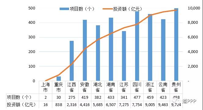 長(zhǎng)江經(jīng)濟(jì)帶覆蓋上海、江蘇、浙江、安徽、江西、湖北、湖南、重慶、四川、云南、貴州等11個(gè)省市。管理庫(kù)累計(jì)長(zhǎng)江經(jīng)濟(jì)帶項(xiàng)目總數(shù)3,739個(gè)、投資額63,000億元,分別占管理庫(kù)的45.1%和51.3%。項(xiàng)目數(shù)前三位是貴州498個(gè)、四川477個(gè)、浙江459個(gè);投資額前三位是貴州9,724億元、云南9,463億元、浙江9,005億元,具體見圖1-9-1。