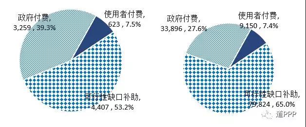 管理庫(kù)累計(jì)使用者付費(fèi)類項(xiàng)目623個(gè)、投資額9,150億元,分別占管理庫(kù)的7.5%和7.4%;累計(jì)可行性缺口補(bǔ)助(即政府市場(chǎng)混合付費(fèi))類項(xiàng)目4,407個(gè)、投資額8.0萬(wàn)億元,分別占管理庫(kù)的53.2%和65.0%;累計(jì)政府付費(fèi)類項(xiàng)目3,259個(gè)、投資額3.4萬(wàn)億元,分別占管理庫(kù)的39.3%和27.6%,具體如圖1-11-3和1-11-4。