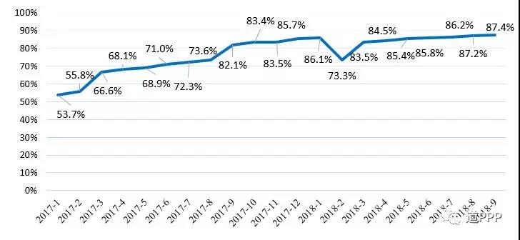 三季度落地示范項(xiàng)目?jī)魷p項(xiàng)目1個(gè)、投資額946億元,項(xiàng)目數(shù)、投資額下滑緣于落地示范項(xiàng)目退庫(kù)。截至2018年三季度,落地示范項(xiàng)目累計(jì)865個(gè)、投資額1.9萬(wàn)億元,落地率87.4%,無(wú)移交階段項(xiàng)目。示范項(xiàng)目總體落地率變化如圖2-2-1。