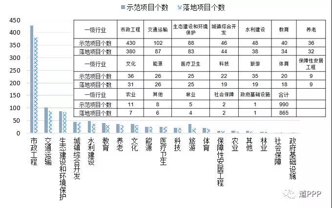 865個(gè)落地示范項(xiàng)目中,市政工程類380個(gè),占43.9%;交通運(yùn)輸類87個(gè),占10.1%;生態(tài)建設(shè)和環(huán)境保護(hù)類83個(gè),占9.6%;其他各類共315個(gè),占36.4%。三季度落地示范項(xiàng)目行業(yè)分布如圖2-3-1,各行業(yè)示范項(xiàng)目數(shù)與落地?cái)?shù)對(duì)比如圖2-3-2。